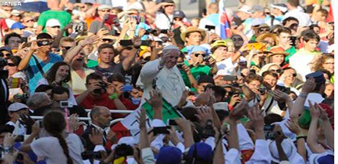 Ya sé que no todos podran venir a Roma, pero el Jubileo es verdaderamente para todos y se celebrará también en sus iglesias locales. Todos estan invitados a este momento de alegría. No preparen sólo mochilas y pancartas, preparen especialmente su corazón y su mente. Mediten bien los deseos que presenten a Jesús en el sacramento de la Reconciliación y de la Eucaristía que celebraremos juntos. Cuando atraviesan la Puerta Santa, recuerden que se comprometen a hacer santa su vida, a alimentarse del Evangelio y la Eucaristía, que son la Palabra y el Pan de la vida, para poder construir un mundo más justo y fraterno.